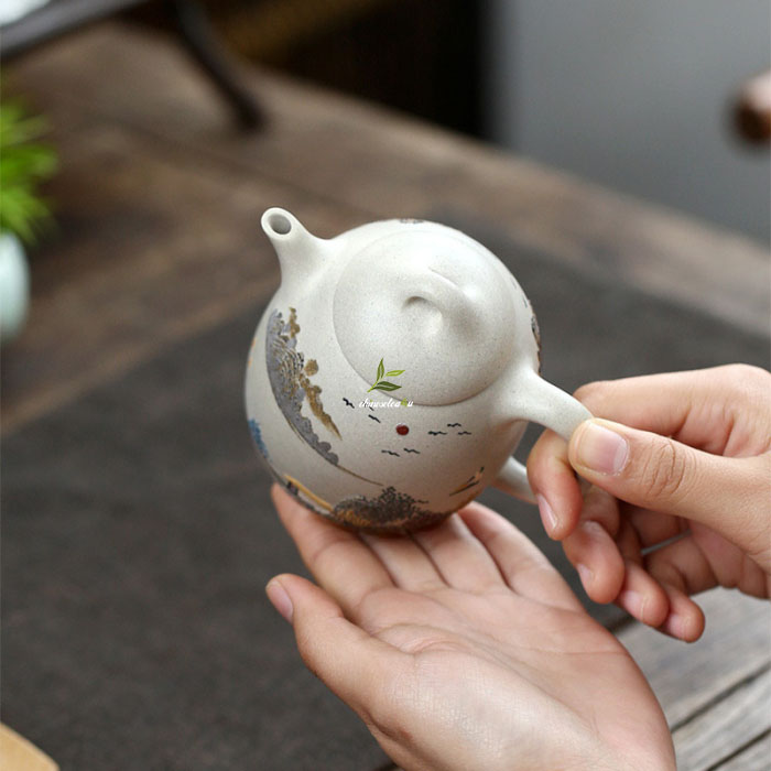 The remarkable landscape painting adorning the teapot is meticulously hand-drawn using various types of Yixing clay. Processed into a thinner state, these clays are skillfully applied with a brush. Achieving the perfect balance of thinness and thickness is crucial – allowing for effortless brushwork while preserving the painting’s intricate textures and depth. Only natural clays (hong ni, zi ni, lu ni, mo lu ni, duan ni, and hei ni clay) are utilized, ensuring the preservation of the art’s authenticity and purity.