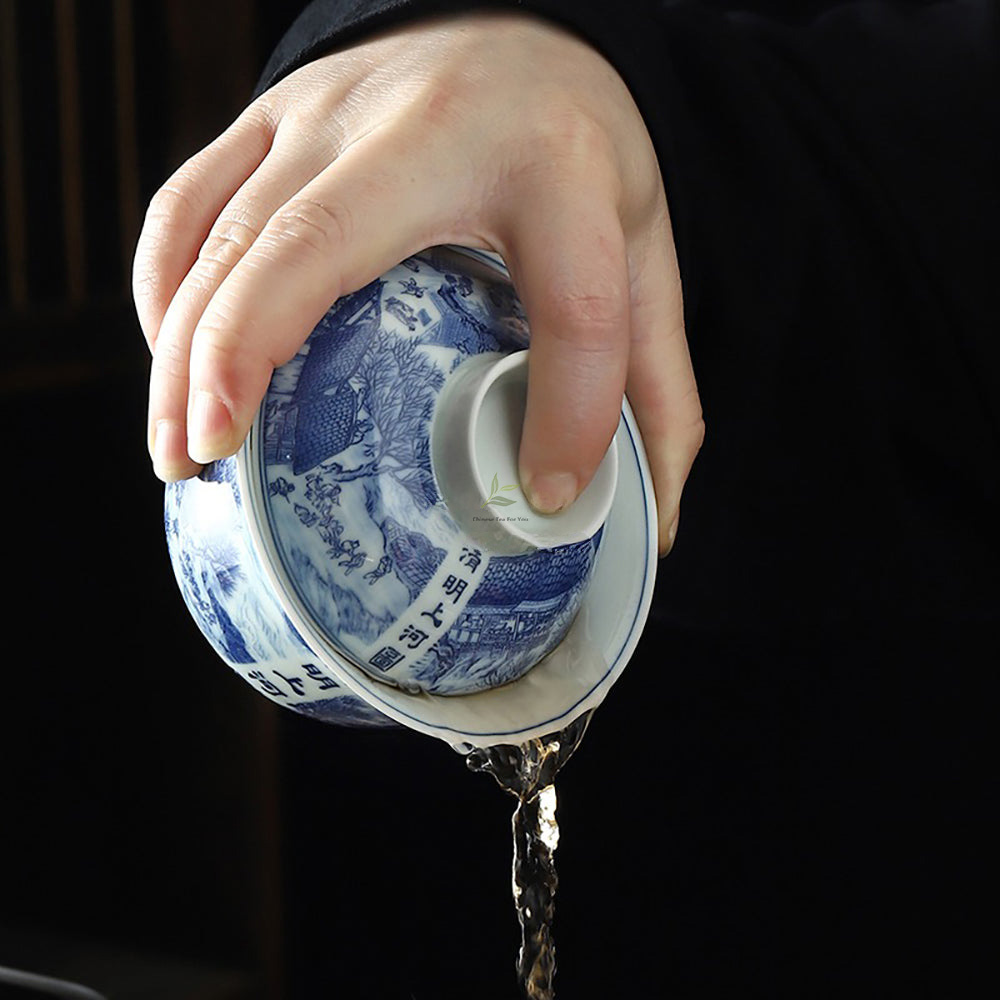 Indulge in the timeless elegance of our underglaze blue porcelain Gaiwan, adorned with the captivating artistry of the “Qingming Riverside Scene.”