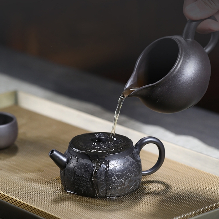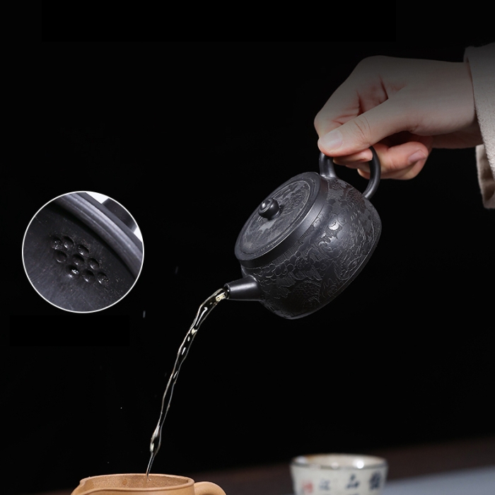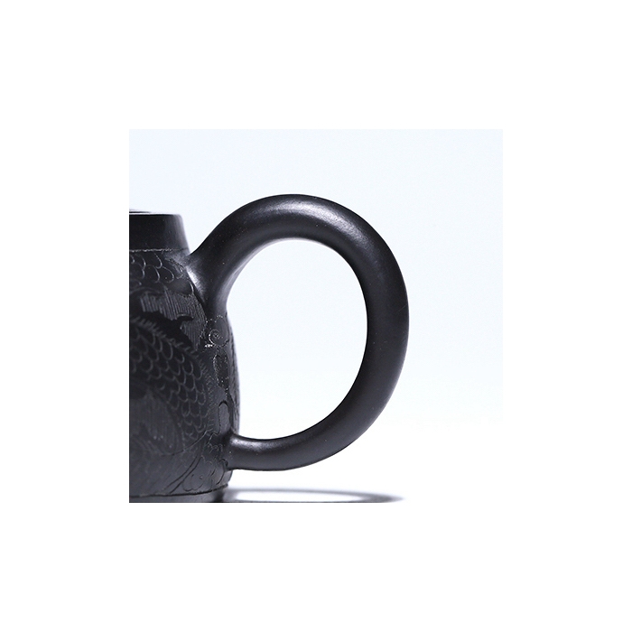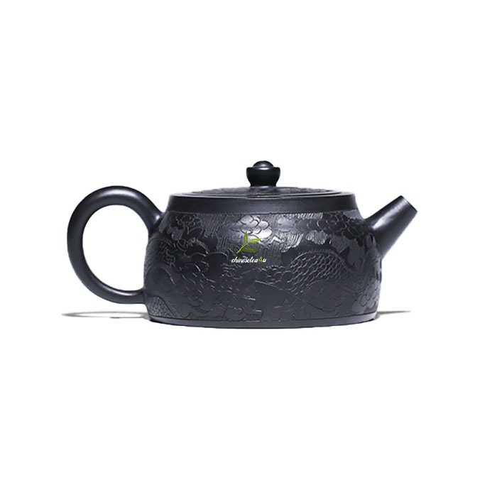 Dragon Carved Black Yixing Shipiao Zisha Teapot, Flat Lid, 180ml