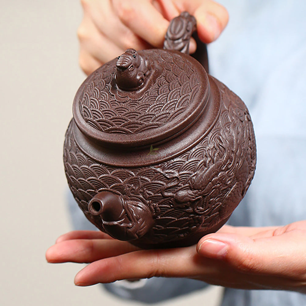 Beyond its majestic dragon, the teapot boasts impeccable craftsmanship. The hollow-out design of the baby dragon resting on the lid adds a playful touch, while the streamlined spout ensures effortless pouring.