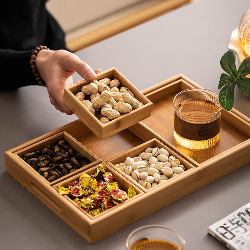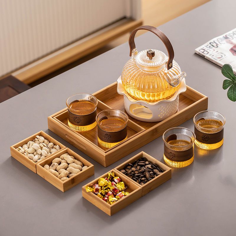 The wooden tea tray, with its modular design and dense texture, offers organized compartments for various ingredients. This thoughtful arrangement enhances functionality and aesthetics, creating a harmoniou tea-drinking space.