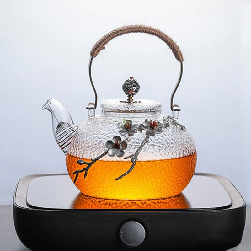 Handcrafted with precision, our Glass Teapot with Tin Plum is a testament to masterful craftsmanship. This stunning piece is artfully blown from high borosilicate glass, renowned for its exceptional resistance to extreme temperatures. With its ability to withstand sudden shifts from -20°C to 150°C, it can be safely heated directly on electric ceramic warmers or over an open flame.