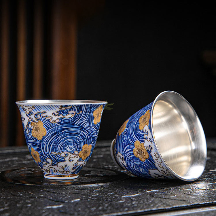 Gold and Blue Gilded Tea Set with Silver Sea Wave Pattern