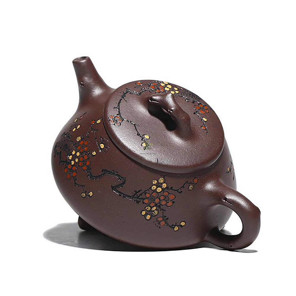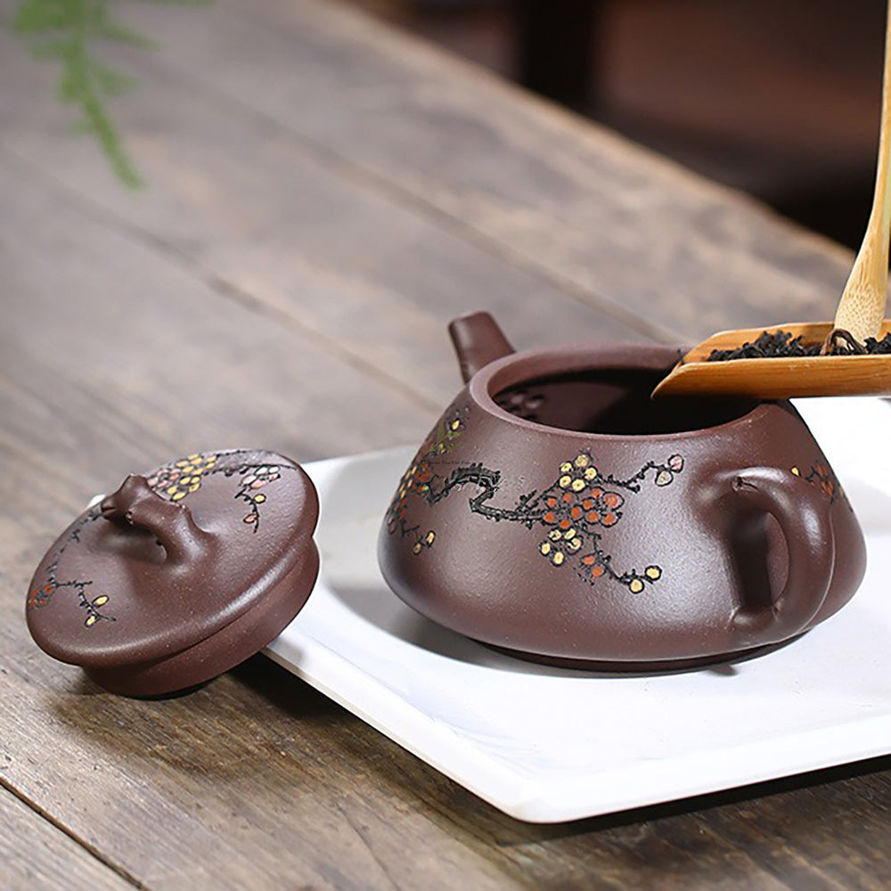 The teapot’s unique silhouette evokes the serene simplicity of a stone scoop, showcasing the craftsman’s keen eye for design. Intricate engravings adorn the body, depicting blooming plum blossoms—a nod to the resilience and beauty of winter flowers. Hand-painted in shades of red and yellow, the petals seem to dance upon the surface, capturing the essence of seasonal change.