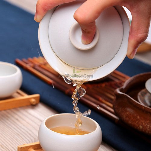 Next, pour fresh boiling water into the Gaiwan, guiding it down the inner edge to initiate a gentle swirl among the leaves. Whether you prefer to sip directly from the Gaiwan or decant into a separate vessel, this artisanal masterpiece allows you to fully immerse yourself in the art of tea brewing.