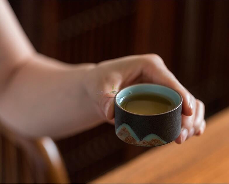 Crafted from coarse pottery, each tea set undergoes a meticulous process of grouting and blank repair. The glaze, applied by hand using traditional techniques, lends an ethereal beauty to the set. The distant mountain glaze pattern, painted with exacting precision, captures the serene landscapes of Japan.