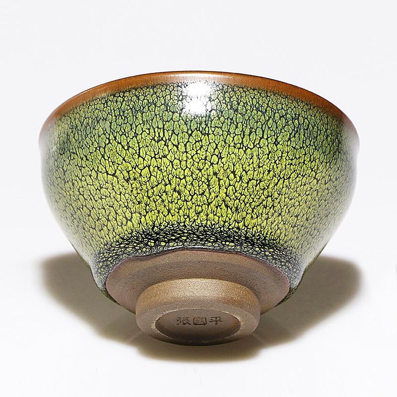 These tea cups are specially glazed at a high heat using a unique glaze with a high iron content, creating a blackened and distinctively beautiful pattern that is exclusive to Jianzhan Tenmoku pottery. The bowl shape with a wide brim allows the tea to stew and cool perfectly.