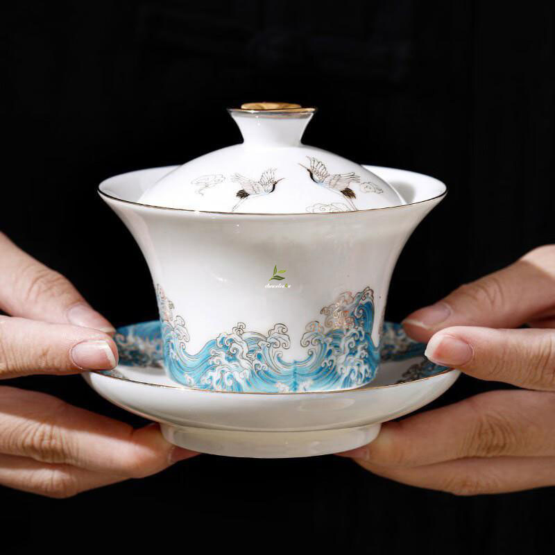 – The teacups feature intricate sea wave patterns and meticulously hand-painted red-crowned cranes, dancing in harmonious unison.