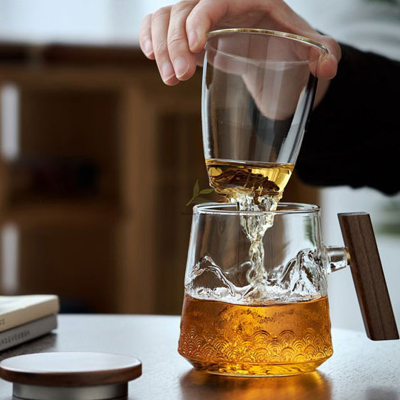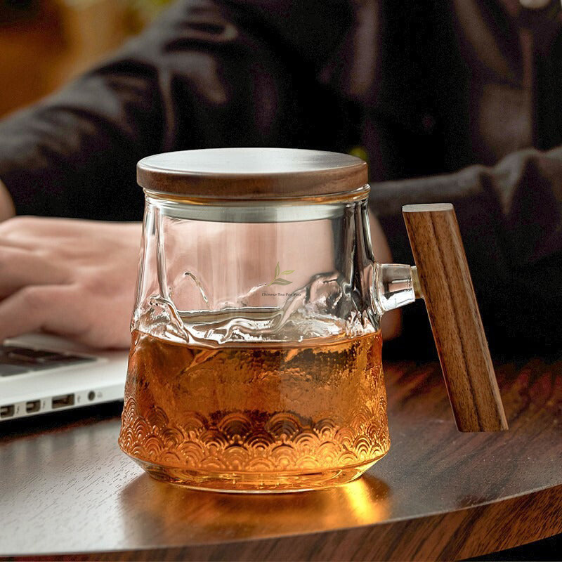 Its sleek design, featuring a minimalist cylindrical shape adorned with an elegant wooden lid and handle, exudes timeless sophistication. The pristine clarity of the glass allows you to witness the captivating dance of tea leaves as they unfurl and release their aromatic essence.