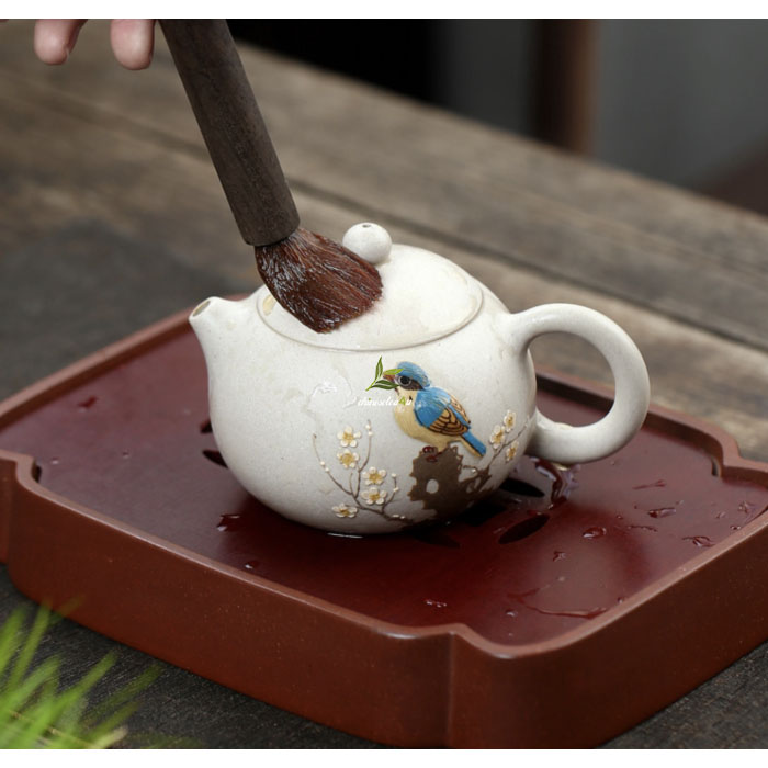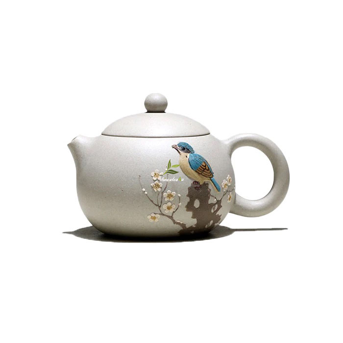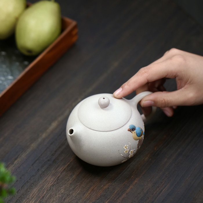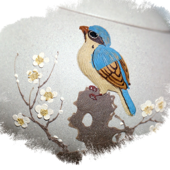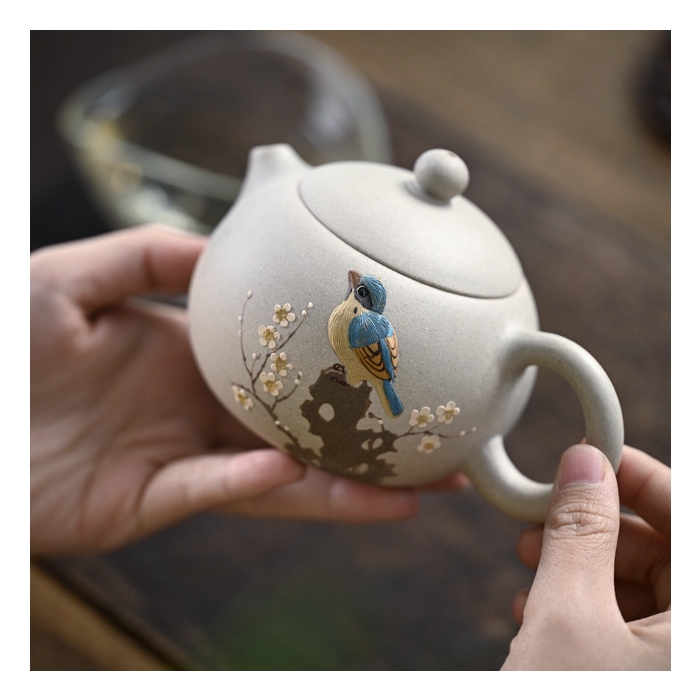 The meticulously applied zisha paste adorning the teapot’s body elevates it to an art form. The intricate layers of clay create a captivating three-dimensional effect, showcasing the artist’s remarkable skill and attention to detail. The vibrant bird and plum blossom motifs come alive as water or tea is poured over the teapot, accentuating the relief effect and adding a touch of magic to your tea ritual.