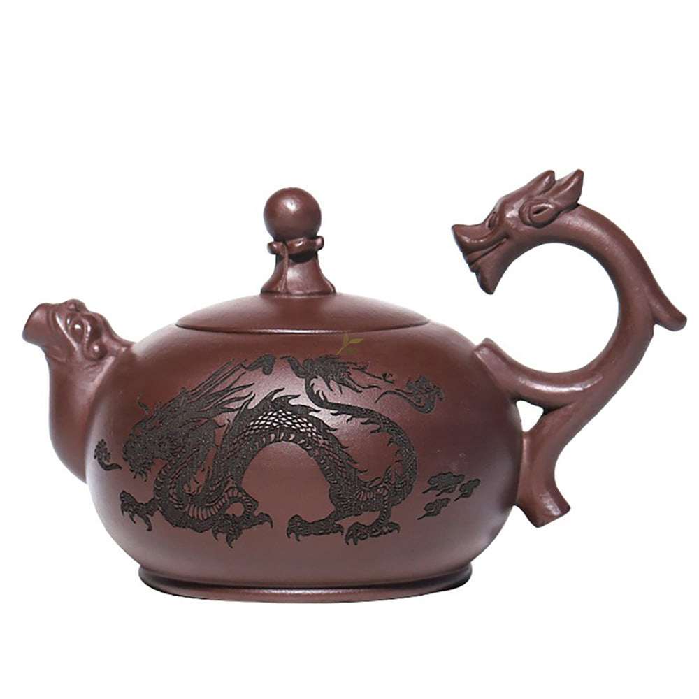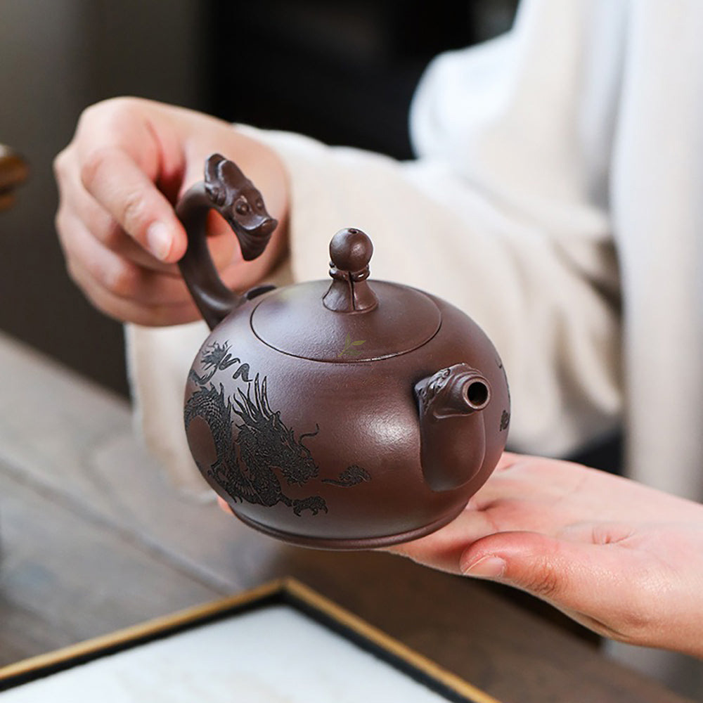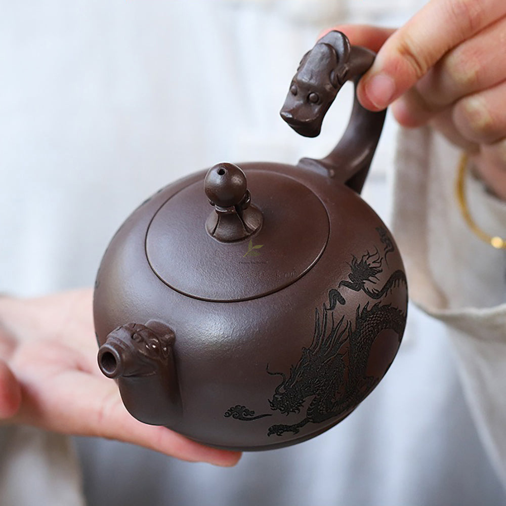 Upon first glance, behold the unparalleled beauty of this magnificent teapot. Its intricately crafted handle subtly mimics the form of a soaring dragon, imbued with lifelike detail. The majestic body of the pot exudes a regal presence, resembling a dragon entrenched within its depths, echoing the dragon-shaped handle. This harmonious design evokes the image of a virtuous sage, both powerful and wise.