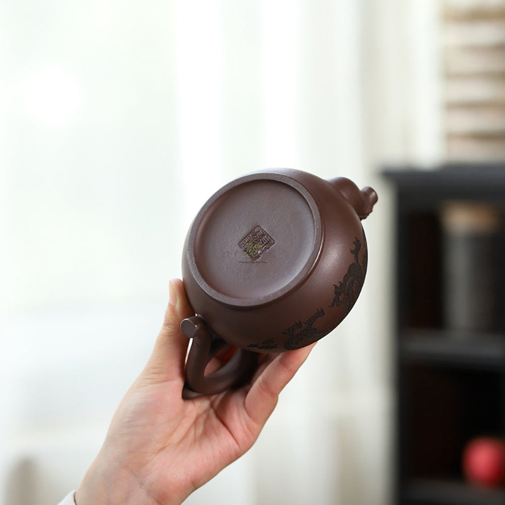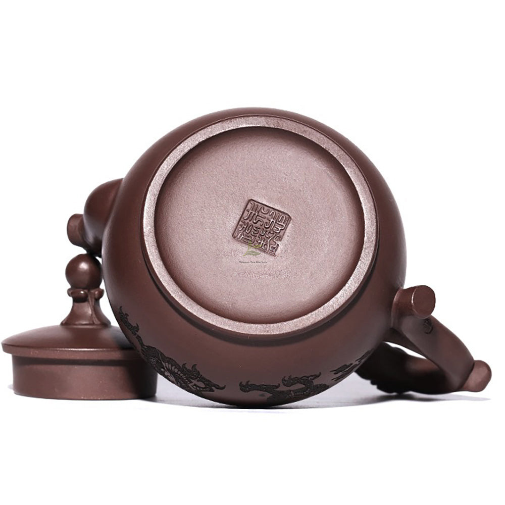 The contrasting dark hue of the teapot’s body accents the brilliance of the dragon’s pearl atop the lid, resembling the radiant sunrise. This combination lends the teapot an air of grandeur and majesty.