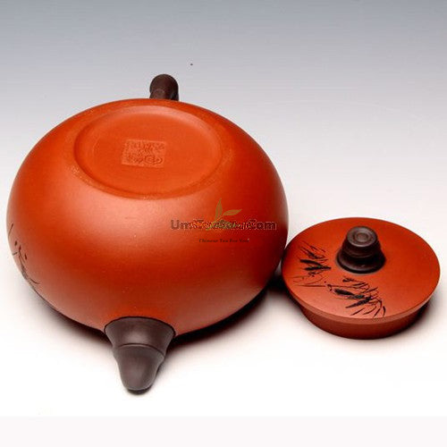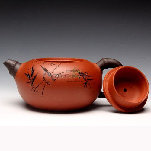Adorned with a serene bamboo theme, the teapot’s bamboo-shaped handle and graceful spout exude an air of tranquility. Intricately etched designs of birds perched on bamboo leaves enhance its visual appeal, imbuing it with a touch of nature’s beauty.
