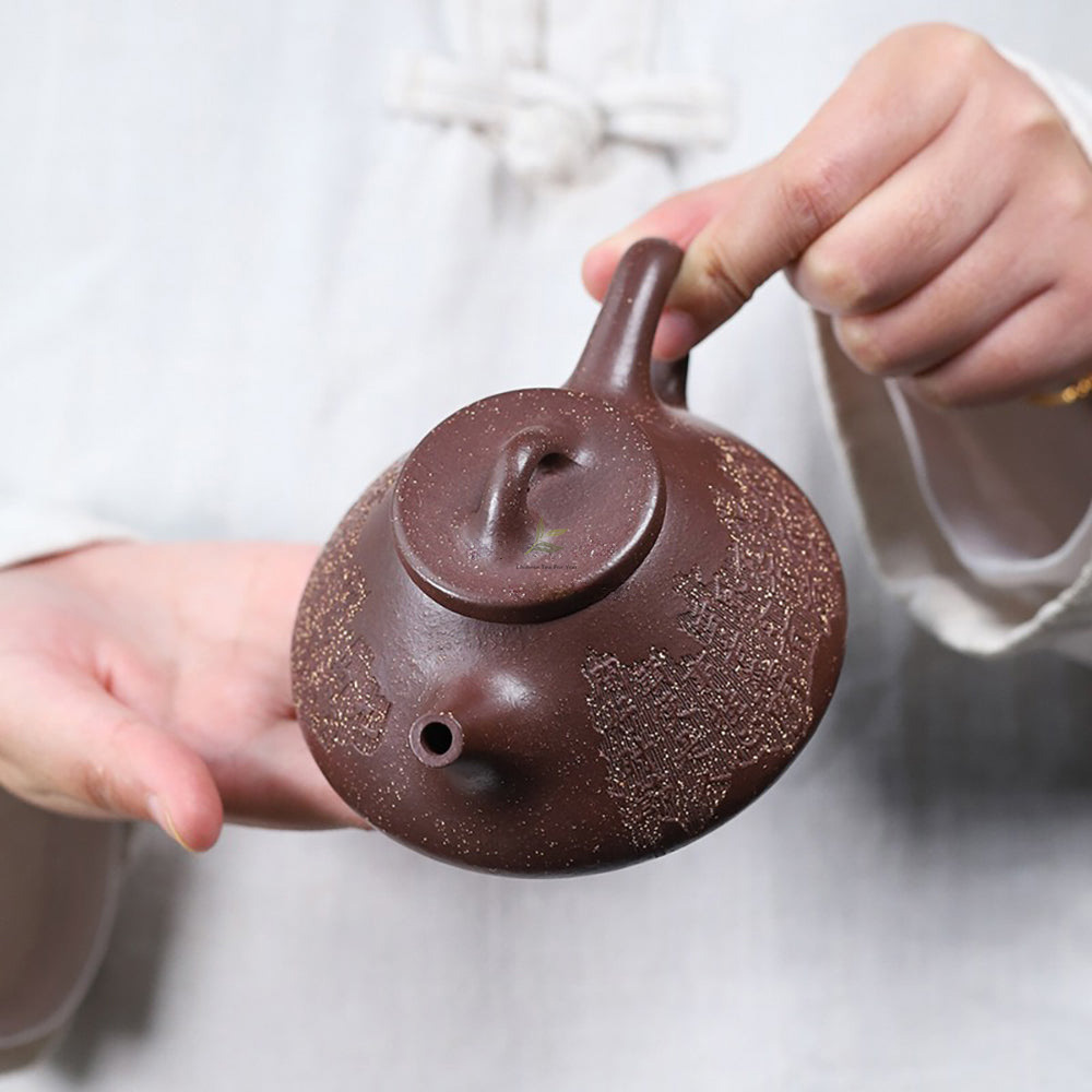 Intricate characters etched onto the teapot’s surface, adorned with gold sand, lend an air of dignified simplicity. Each curve and connecting point showcases the maker’s meticulous attention to detail, resulting in a fluid, visually compelling masterpiece.