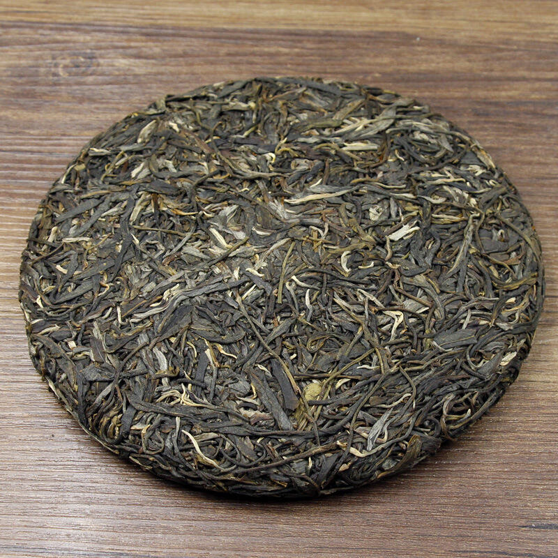 The tea cake is regular in shape, uniform in thickness and moderate in tightness. Silver buds are clearly visible in the strips, and their color is dark green and moist.